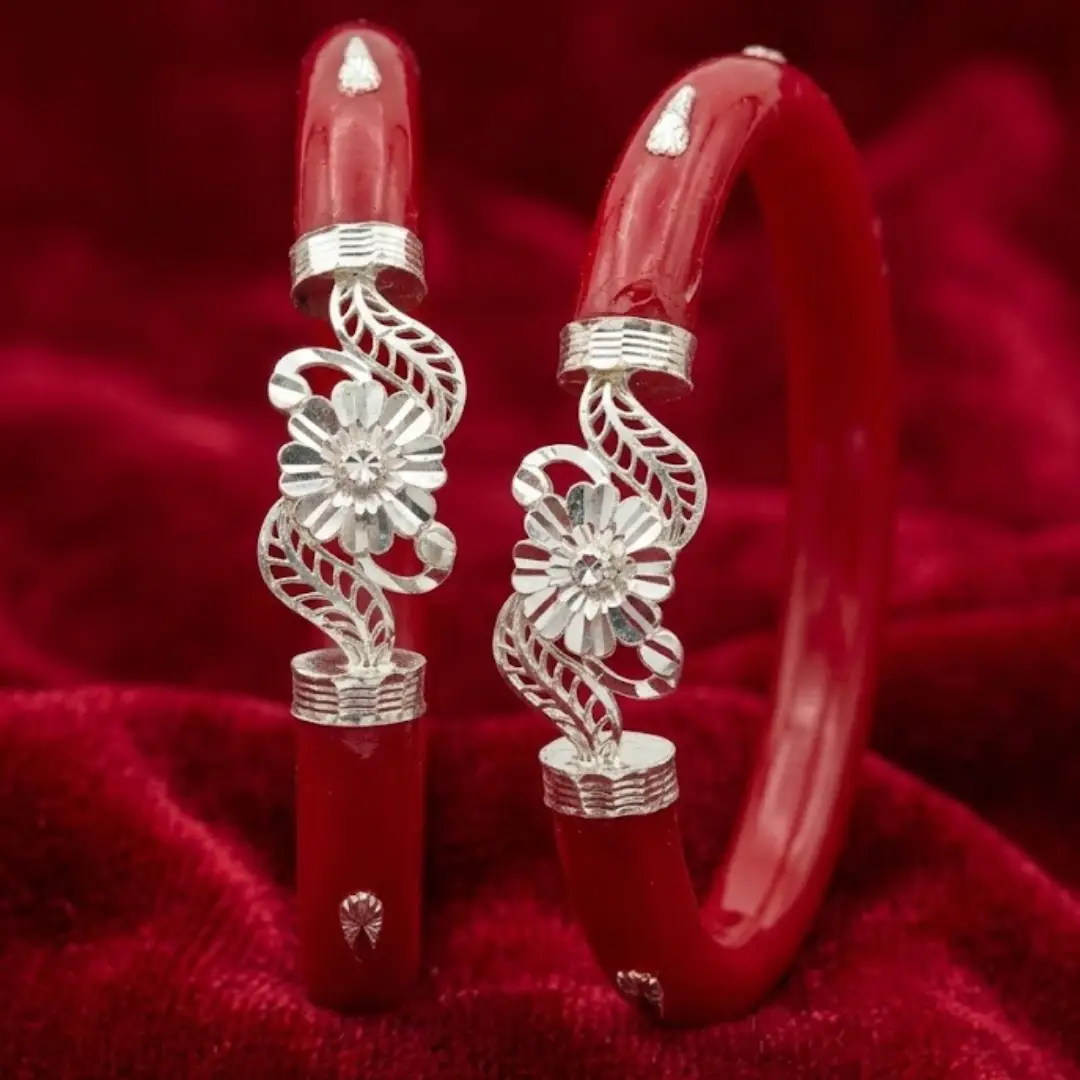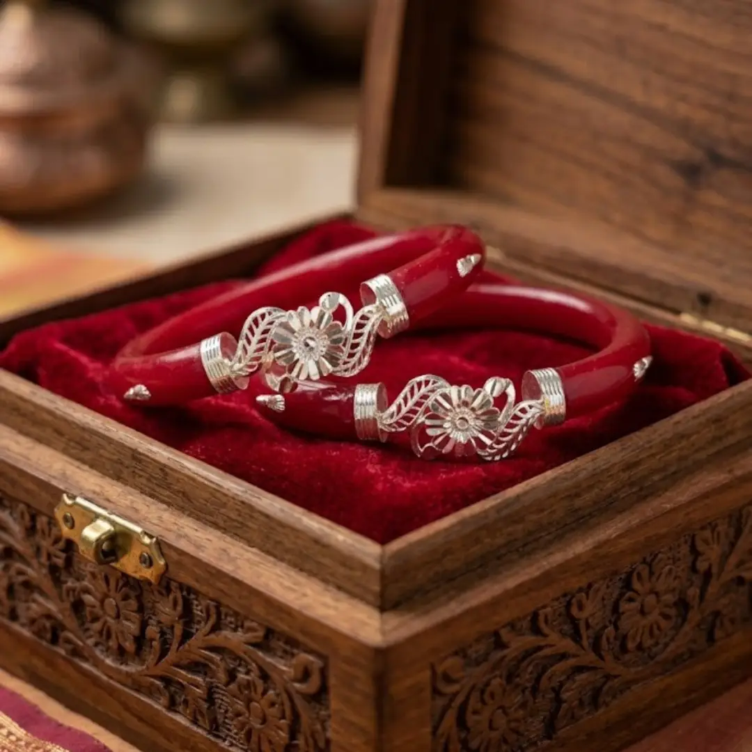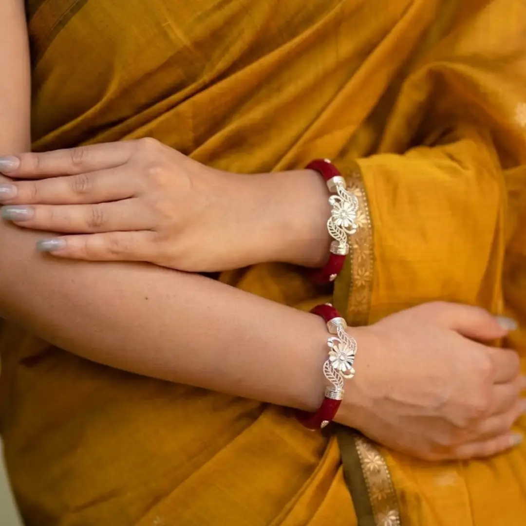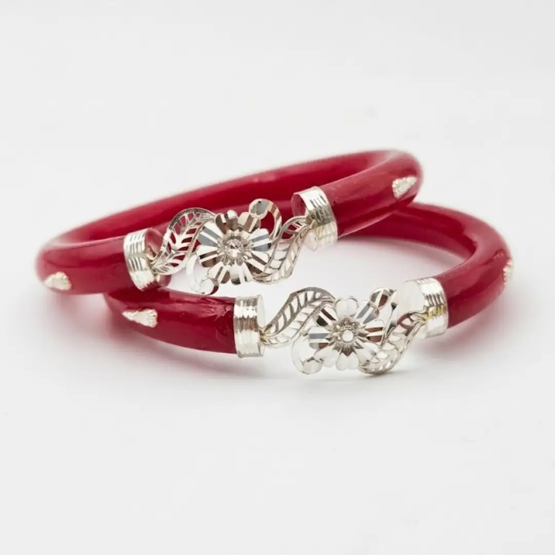 Elevate your traditional attire with our exquisite 925 Silver Pola Bangle. This beautiful piece of jewelry combines the cultural significance of the red Pola with the luxury of fine silver. Each bangle is meticulously crafted featuring intricate silver floral patterns and leaf motifs that wrap elegantly around the vibrant red base.