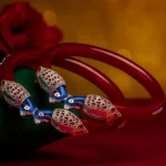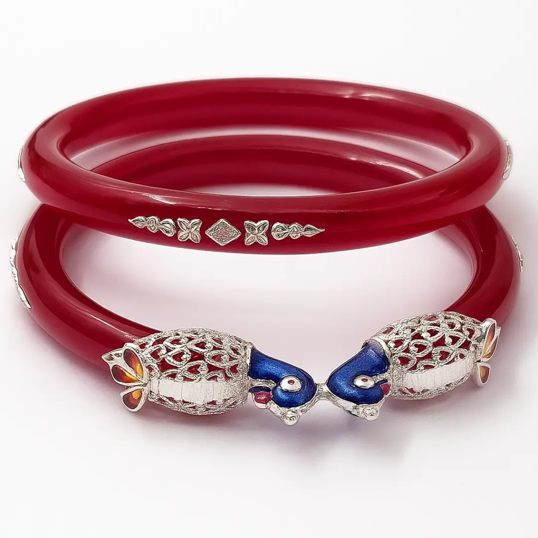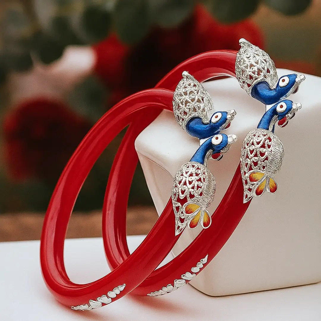 Celebrate timeless tradition with this elegant red bangle bracelet, highlighted by a beautifully crafted silver-tone peacock motif clasp. The vibrant red lacquered bangle is complemented by intricately detailed peacock heads with blue enamel accents, symbolizing grace and beauty. Smoothly finished and lightweight, this openable bangle offers both comfort and statement appeal. Perfect for festive occasions, weddings, and ethnic wear, this piece is an excellent addition to wholesale and boutique jewelry collections.