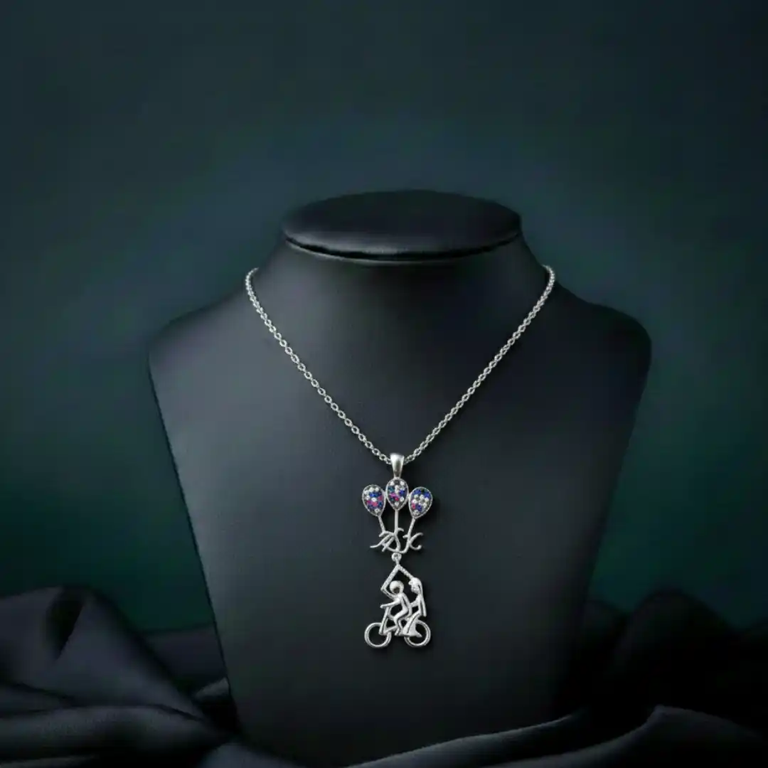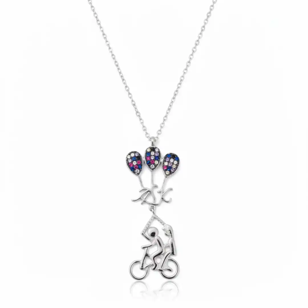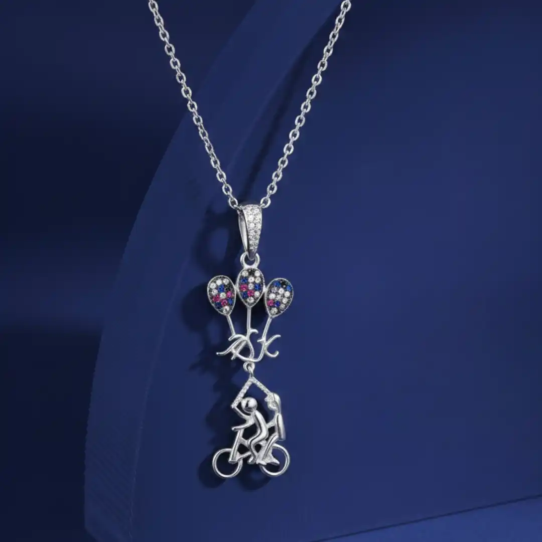 ake a whimsical ride with this enchanting silver bicycle pendant necklace, featuring delicate balloon charms adorned with sparkling multicolor crystals. The unique design captures a sense of adventure, freedom, and fun, making it a perfect statement piece for dreamers and cycling enthusiasts alike. Crafted from high-quality silver, this lightweight and versatile necklace pairs effortlessly with both casual and elegant outfits. Whether you’re a lover of unique jewelry or looking for a thoughtful gift for a free spirit, this balloon bicycle necklace is sure to inspire joy and wonder.