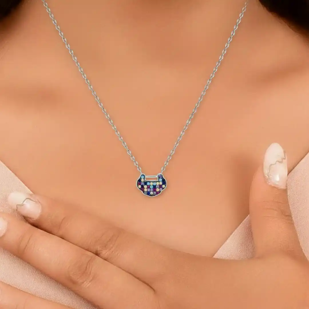 Enhance your daily style with our signature Silver Handbag Chain Pendant. At The VelvetBox, we believe in creating jewellery that reflects your unique personality and flair. This specific accessory features a whimsical handbag-shaped design encrusted with vibrant, multicolored crystals. Consequently, the piece catches the light beautifully from every angle, making it a standout addition to any outfit.