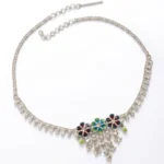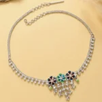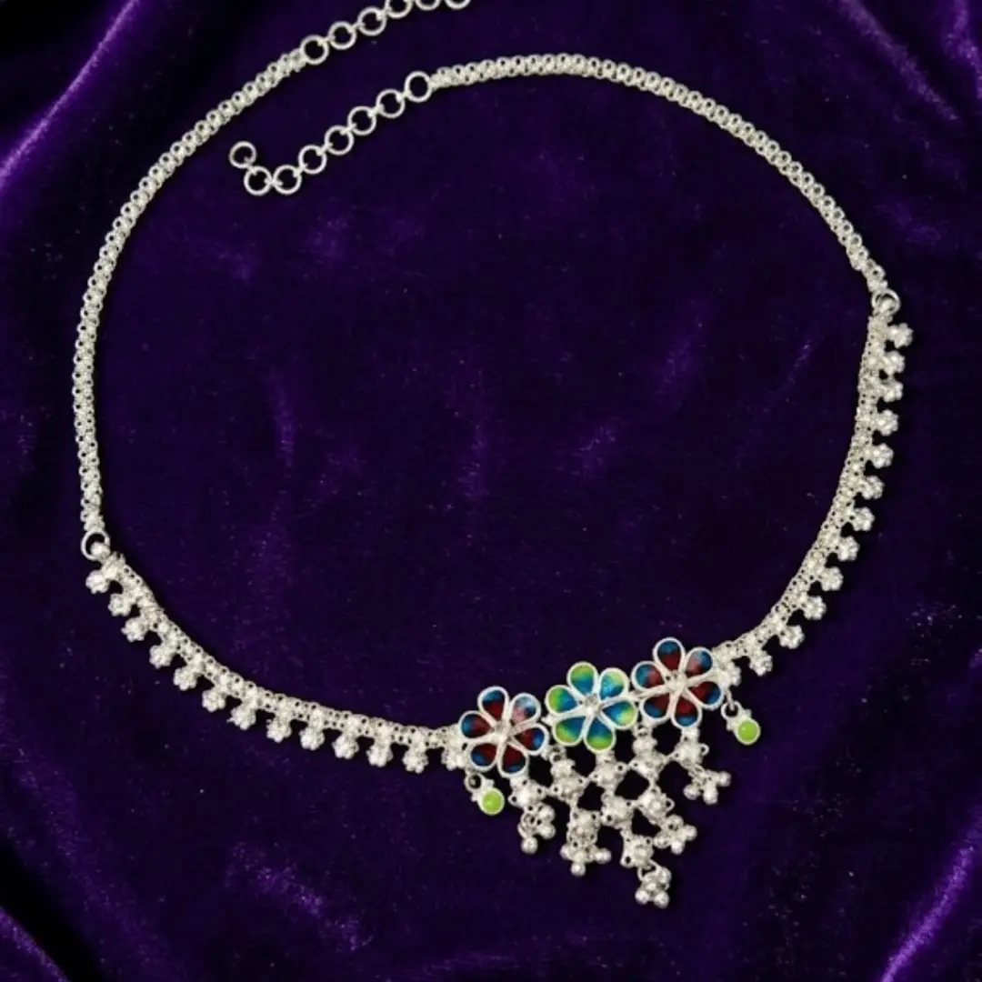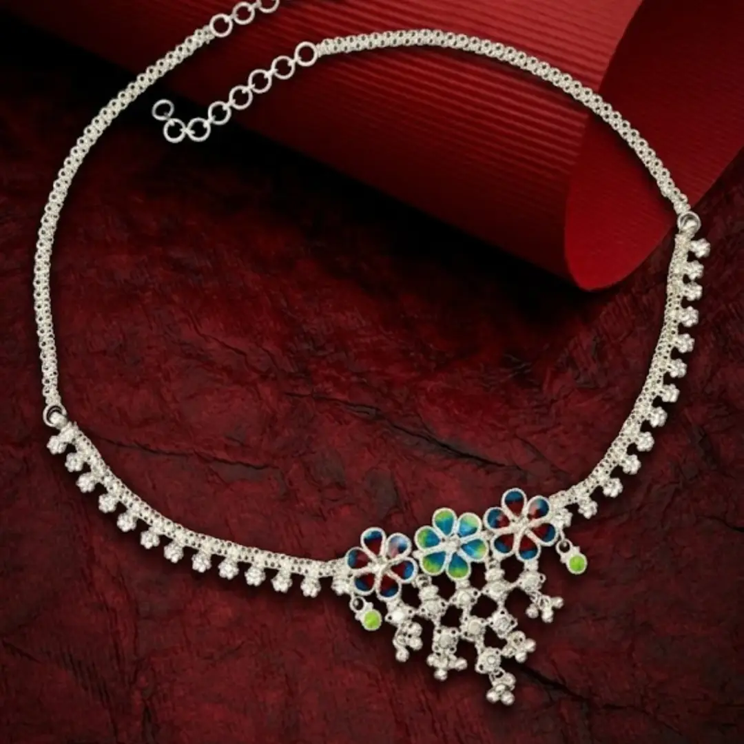 What sets this design apart is the delicate fringe of silver ball charms and small green stone droplets that dangle elegantly from the floral center. The necklace is supported by a fine-textured silver chain, offering a lightweight and comfortable feel. This pure silver necklace for women and girls is perfect for those who prefer subtle yet vibrant jewelry for daily wear or special gatherings.