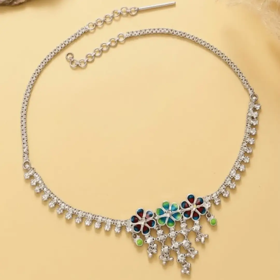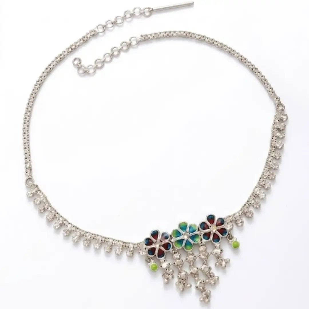 Add a touch of grace to your ensemble with the 925 Sterling Silver Ethnic Meenakari Charmed Drop Necklace. This piece is a beautiful representation of traditional craftsmanship meeting modern aesthetics. The centerpiece showcases three handcrafted floral motifs finished with a rich palette of maroon, teal blue, and lime-green enamel (Meenakari) work.