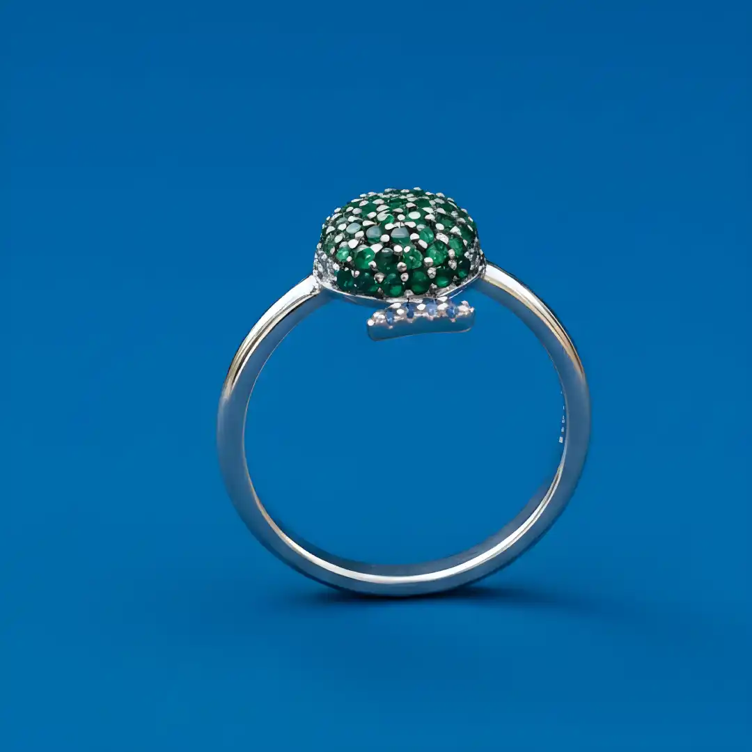 Add a playful sparkle to your collection with our Emerald Charm – Sterling Silver Apple Ring. Crafted from genuine 925 sterling silver, this ring features a charming apple-shaped centerpiece adorned with dazzling green and black crystals, capturing the essence of nature with a modern twist. A delicate leaf detail encrusted with purple stones adds an extra pop of elegance and whimsy.