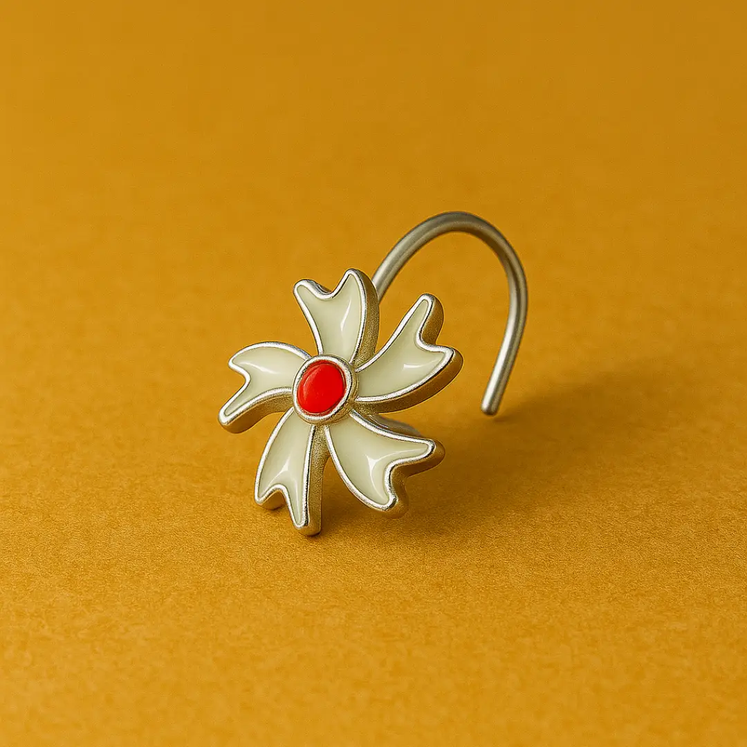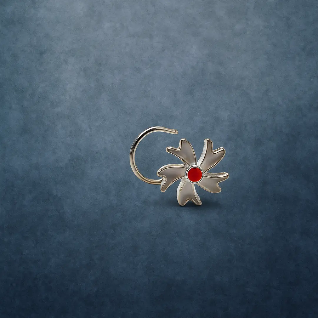 Add a touch of classic elegance to your look with this beautifully crafted 925 Sterling Silver Nose Pin from The Velvet Box. Designed in a delicate floral pattern, this nose pin features smooth silver petals accented with a vibrant red center stone, creating a timeless and graceful appeal.