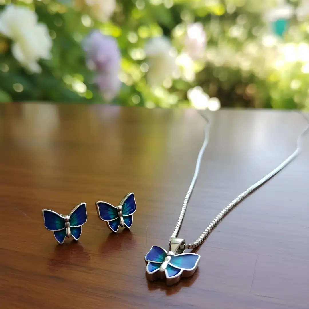 Enhance your look with this elegant silver butterfly jewelry set, featuring a stunning pendant and matching stud earrings. Designed with vibrant blue and turquoise enamel detailing, this set beautifully symbolizes grace, transformation, and freedom. Whether for daily wear or special occasions, it adds a stylish and sophisticated touch to any outfit. A perfect gift choice for loved ones or a timeless addition to your own collection.