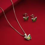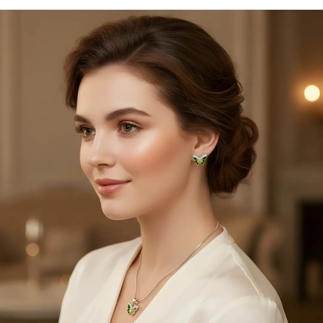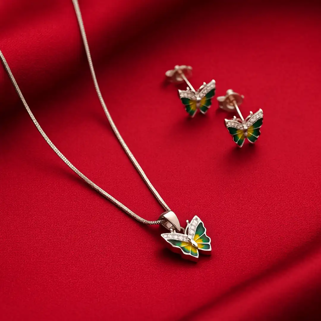 Add a touch of elegance and charm to your collection with this exquisite Silver Butterfly Pendant and Matching Earrings Set. Designed with vibrant green enamel wings and sparkling stone accents, this set captures the beauty of nature and sophistication in one. The lightweight design ensures comfort, making it perfect for both casual and festive wear.