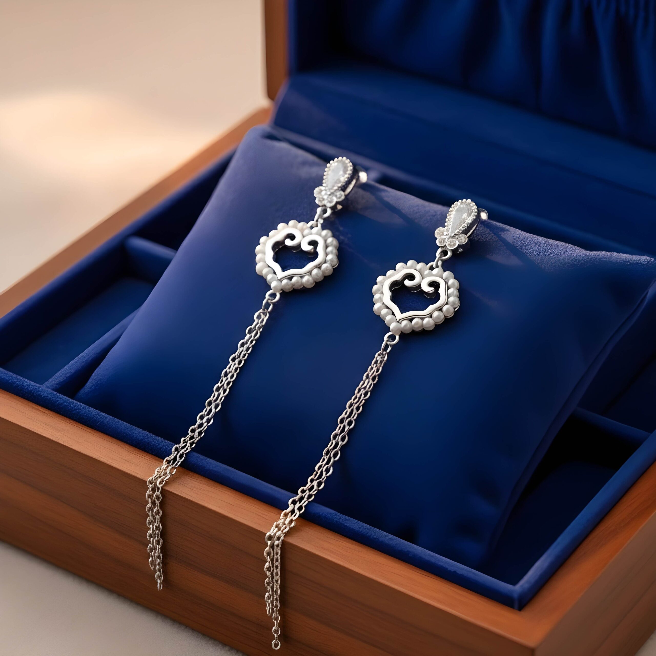 The Velvet Box Elegant Silver Heart Dangle Earrings with Pearl and Chain Tassels