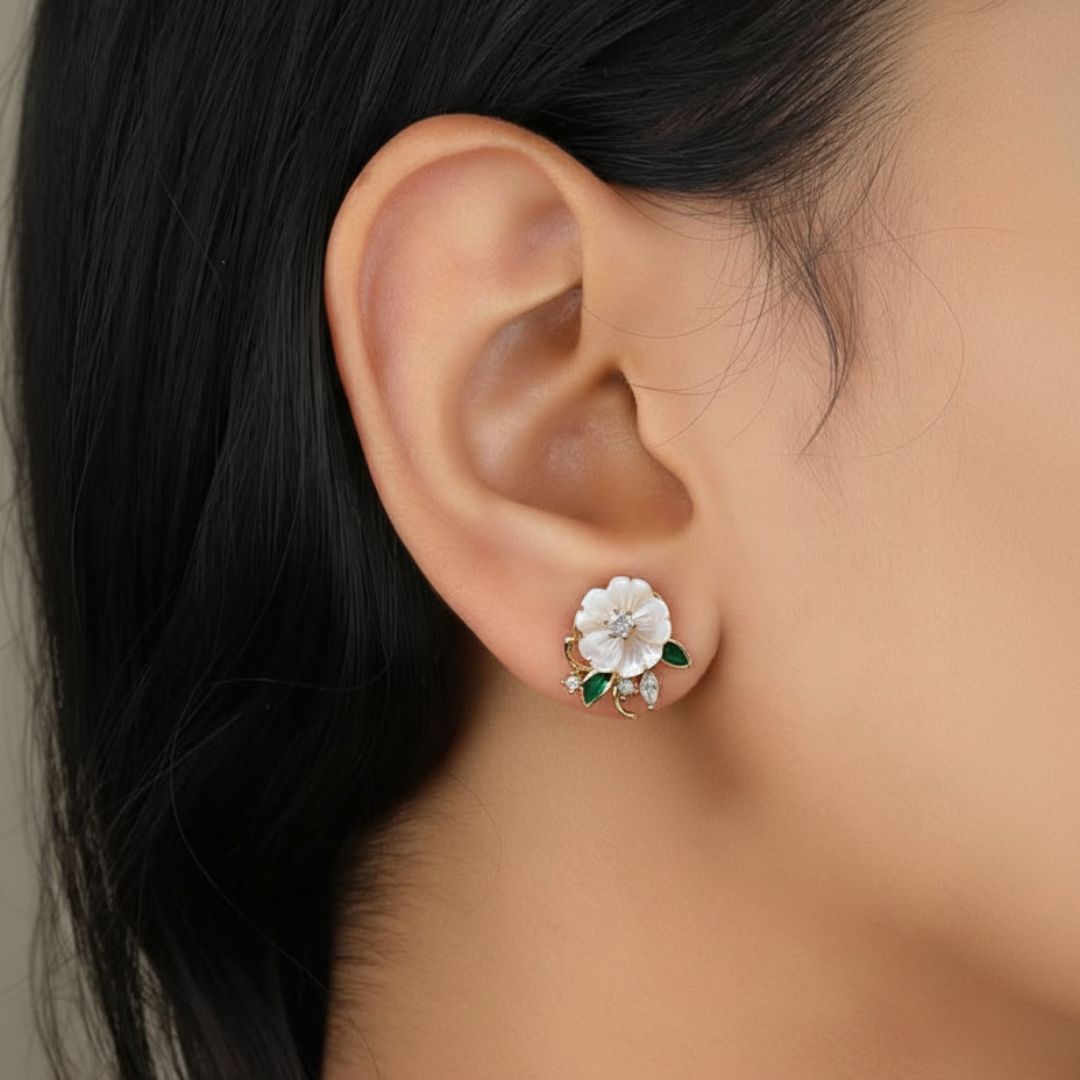 Add a touch of nature-inspired elegance to your style with these exquisite floral stud earrings. Featuring delicately carved white petals with a shimmering crystal centerpiece, the design is enhanced by green enamel leaves and marquise-shaped stones, all set in a radiant gold base. Perfect for casual wear, festive looks, or gifting, these earrings bring charm, sophistication, and sparkle to every occasion