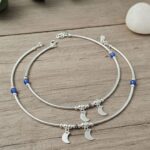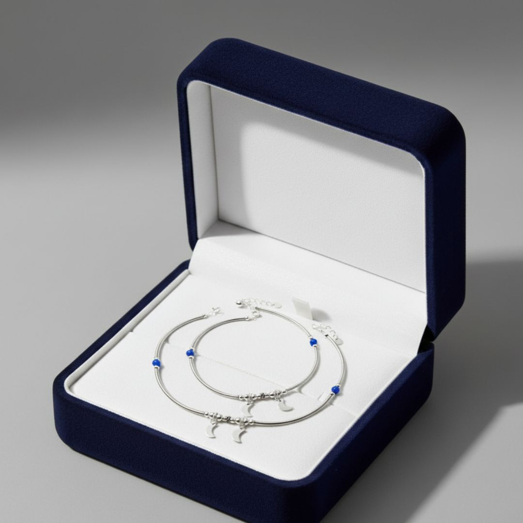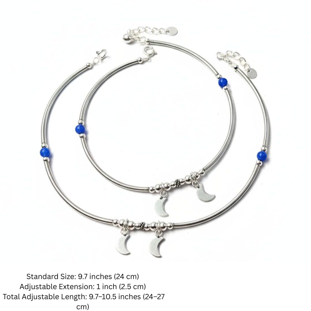 Shine with celestial charm wearing this elegant silver anklet adorned with delicate crescent moon pendants and vibrant blue beads. Crafted with precision from premium-quality silver, this anklet adds a touch of sophistication and sparkle to your everyday style. The adjustable chain ensures a perfect fit, making it ideal for daily wear or festive occasions. A beautiful blend of grace and elegance, this moon-themed anklet is perfect for women who love subtle yet striking jewelry.