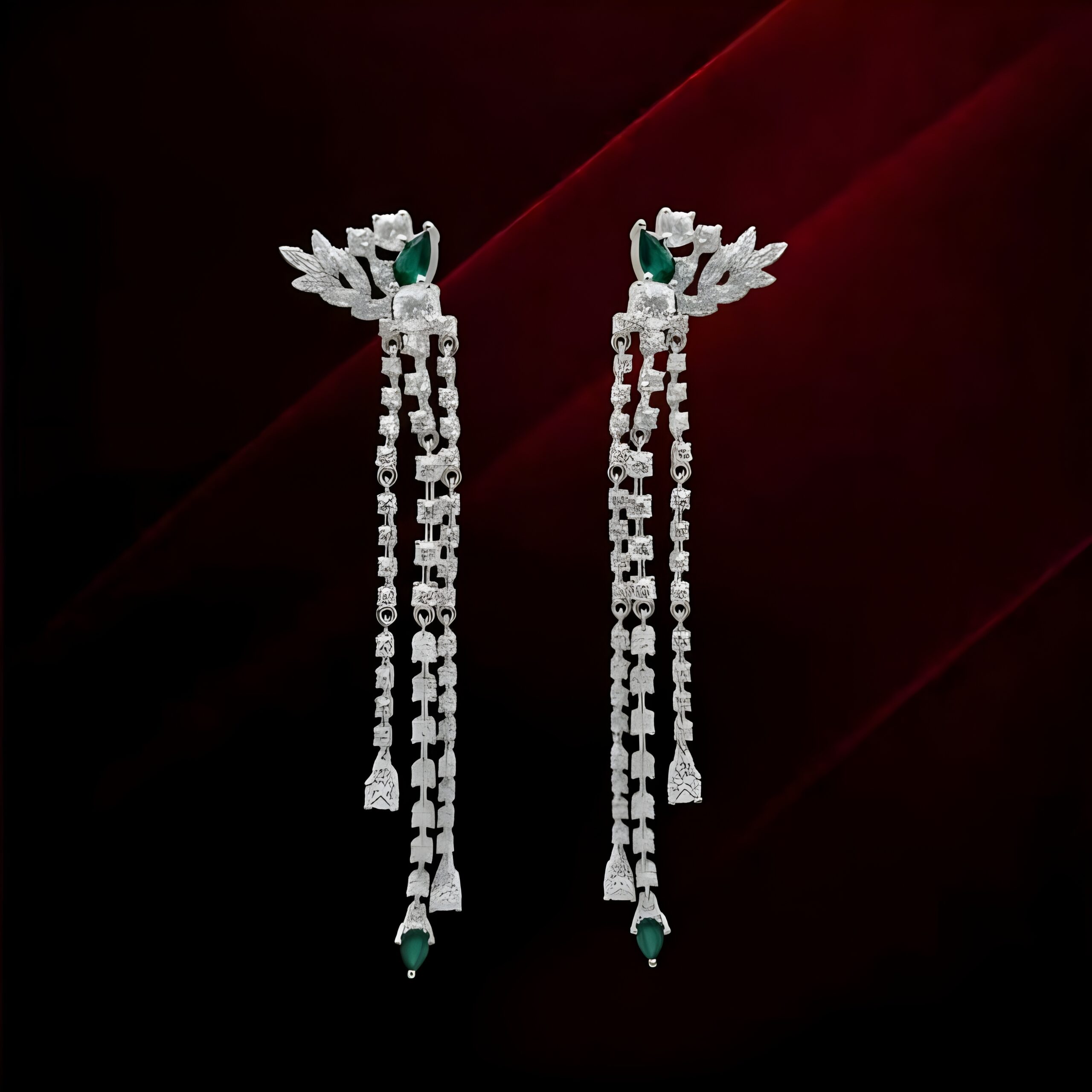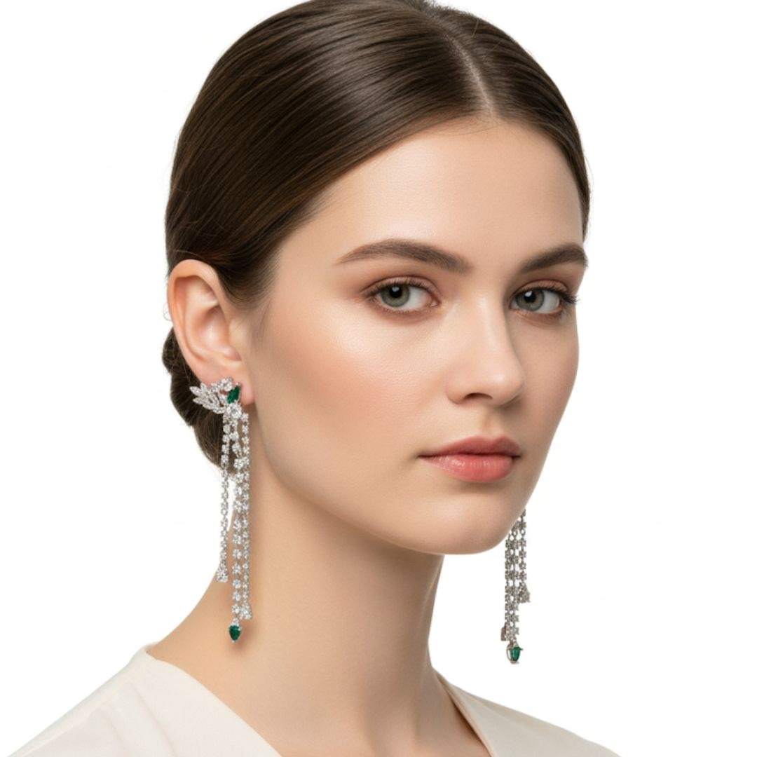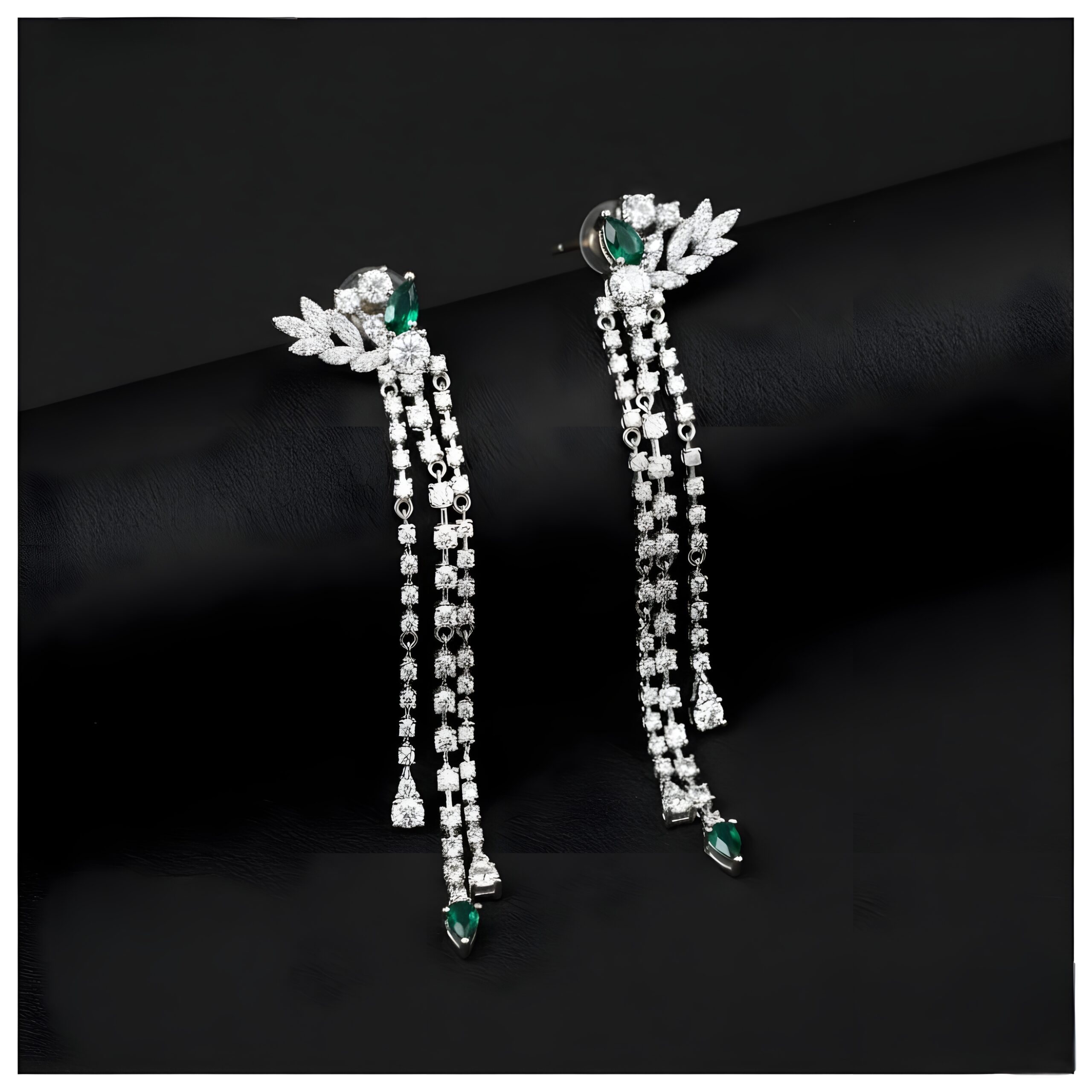 Elevate your elegance with these exquisite Silver Dangle Earrings, featuring vibrant green gemstones. Expertly crafted from high-quality silver, each earring showcases a graceful cascade of sparkling diamonds that perfectly complement the rich green hue of the gemstones. The flowing, waterfall-inspired design catches the light beautifully, adding sophistication and glamour to any outfit. Ideal for special occasions or formal events, these earrings combine timeless craftsmanship with contemporary style.
