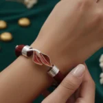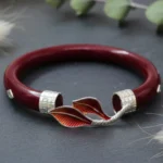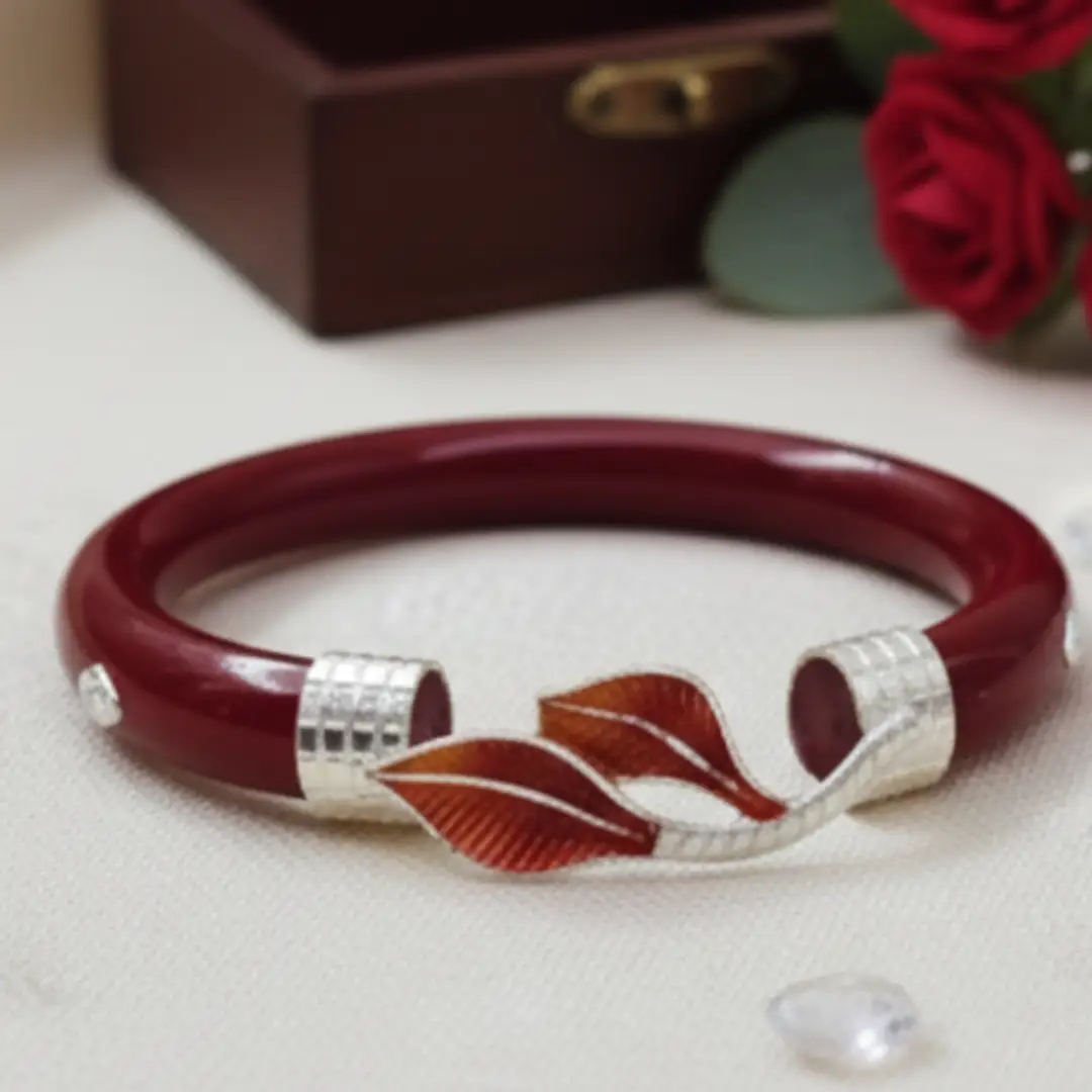Enhance your jewellery collection with The Velvet Box wholesale 925 sterling silver Pola bangle, crafted in a rich maroon Pola base and adorned with an elegant silver leaf motif featuring fine enamel detailing. This bangle reflects a perfect blend of traditional craftsmanship and contemporary design. Lightweight and comfortable, it is ideal for daily wear, festive occasions, and ethnic styling. A premium choice for jewellery retailers and resellers.
