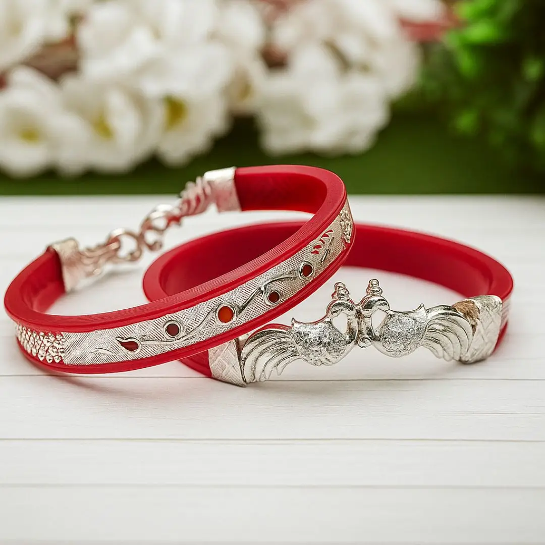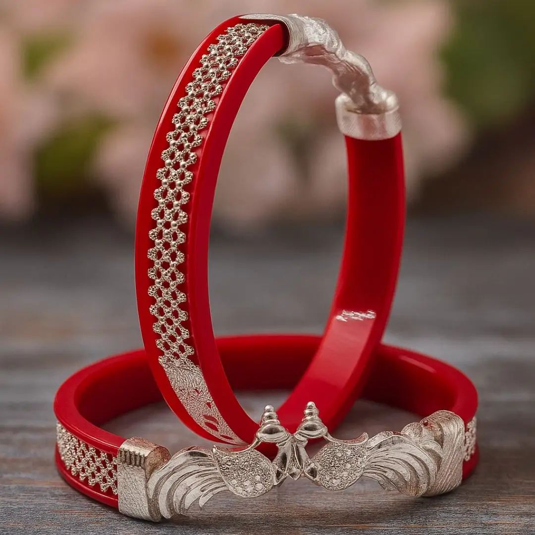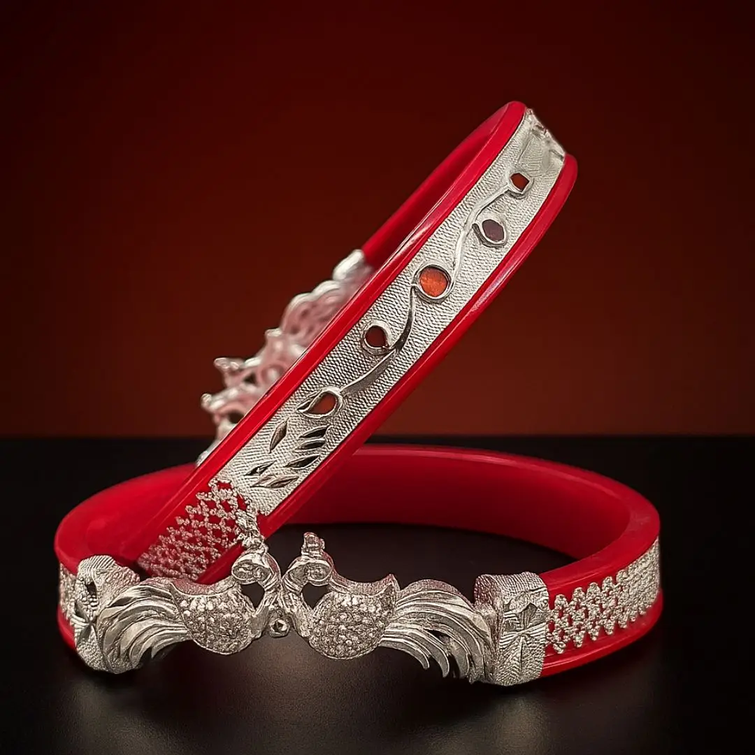 Add a touch of royal elegance to your jewellery collection with The Velvet Box wholesale 925 sterling silver Pola bangles. Crafted with a vibrant red Pola base, these bangles feature intricate silver detailing along the body and a beautifully sculpted peacock-inspired centerpiece. The rich craftsmanship and traditional design make them perfect for weddings, festive occasions, and bridal wear. An excellent wholesale choice for retailers offering premium ethnic silver jewellery.