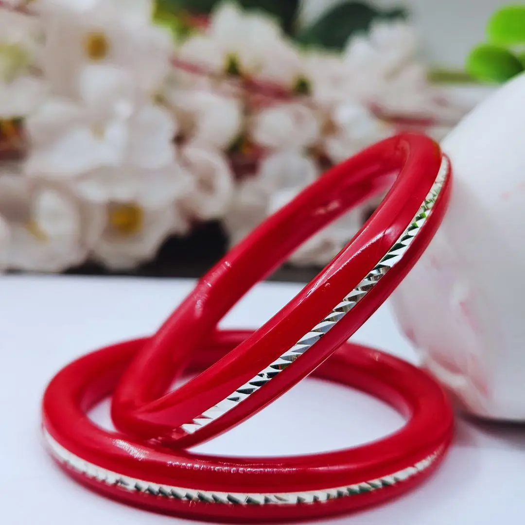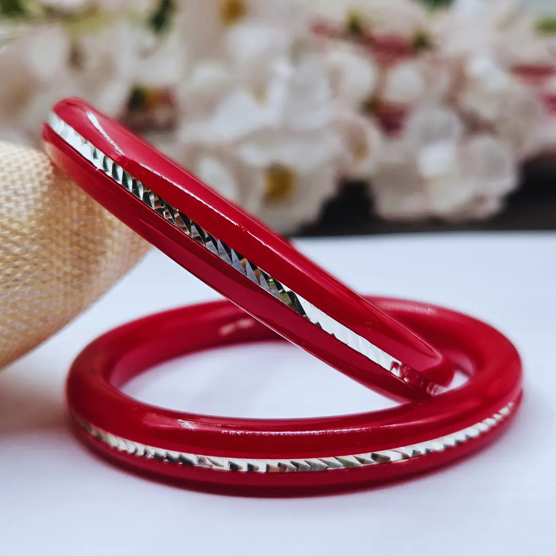 The Velvet Box presents these elegant wholesale 925 sterling silver Pola bangles, crafted with a rich maroon Pola base and finished with a subtle silver lining detail. Simple yet classy, these bangles are designed for everyday wear as well as traditional and festive styling. Their lightweight feel and smooth polish ensure comfort, while the minimal design makes them easy to pair with ethnic and casual outfits. A perfect wholesale option for retailers seeking timeless silver jewellery essentials.