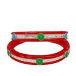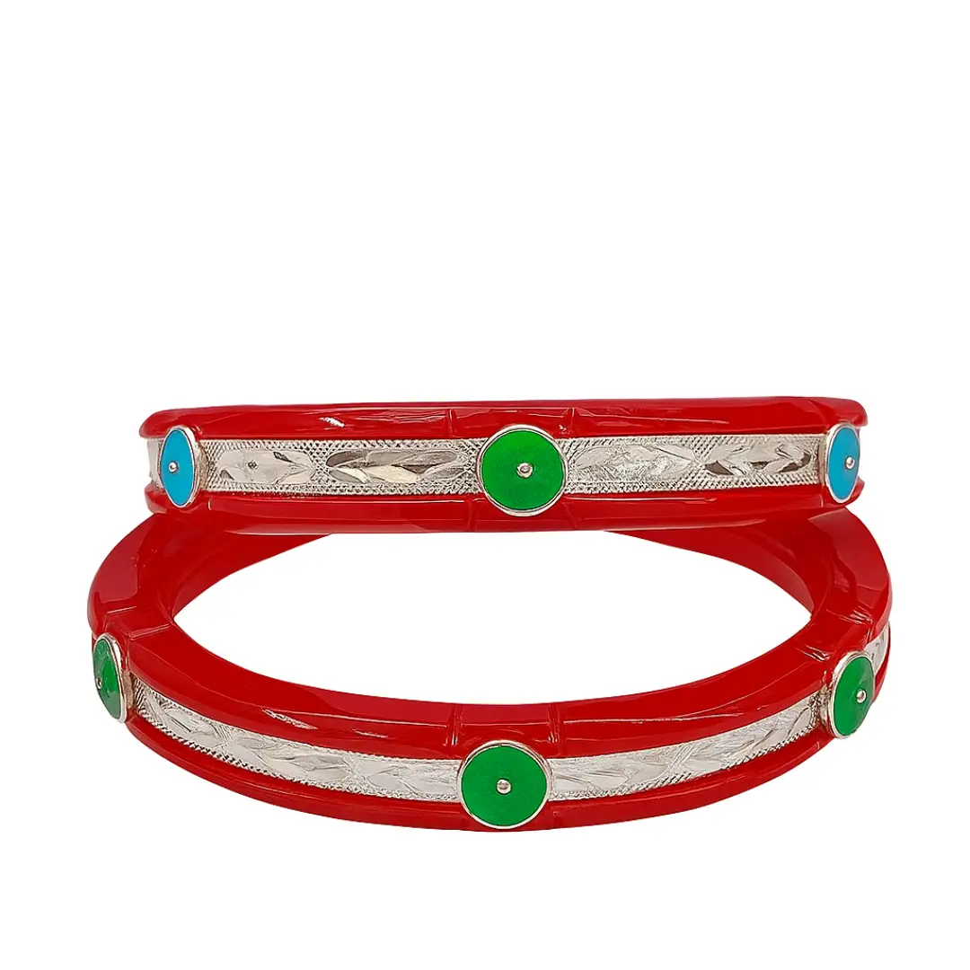 Upgrade your ethnic jewellery collection with this elegant red bangle pair from The Velvet Box Wholesale. Designed with a glossy red base, these bangles feature detailed silver cutwork panels and round green enamel stud accents, giving a classic yet eye-catching traditional look.