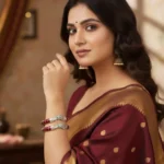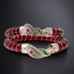his exquisite maroon motif peacock pola showcases traditional craftsmanship with a rich maroon enamel base and an intricately designed silver peacock motif. The detailed filigree work, highlighted with subtle green and blue enamel accents, gives the bracelet a regal and ethnic appeal.