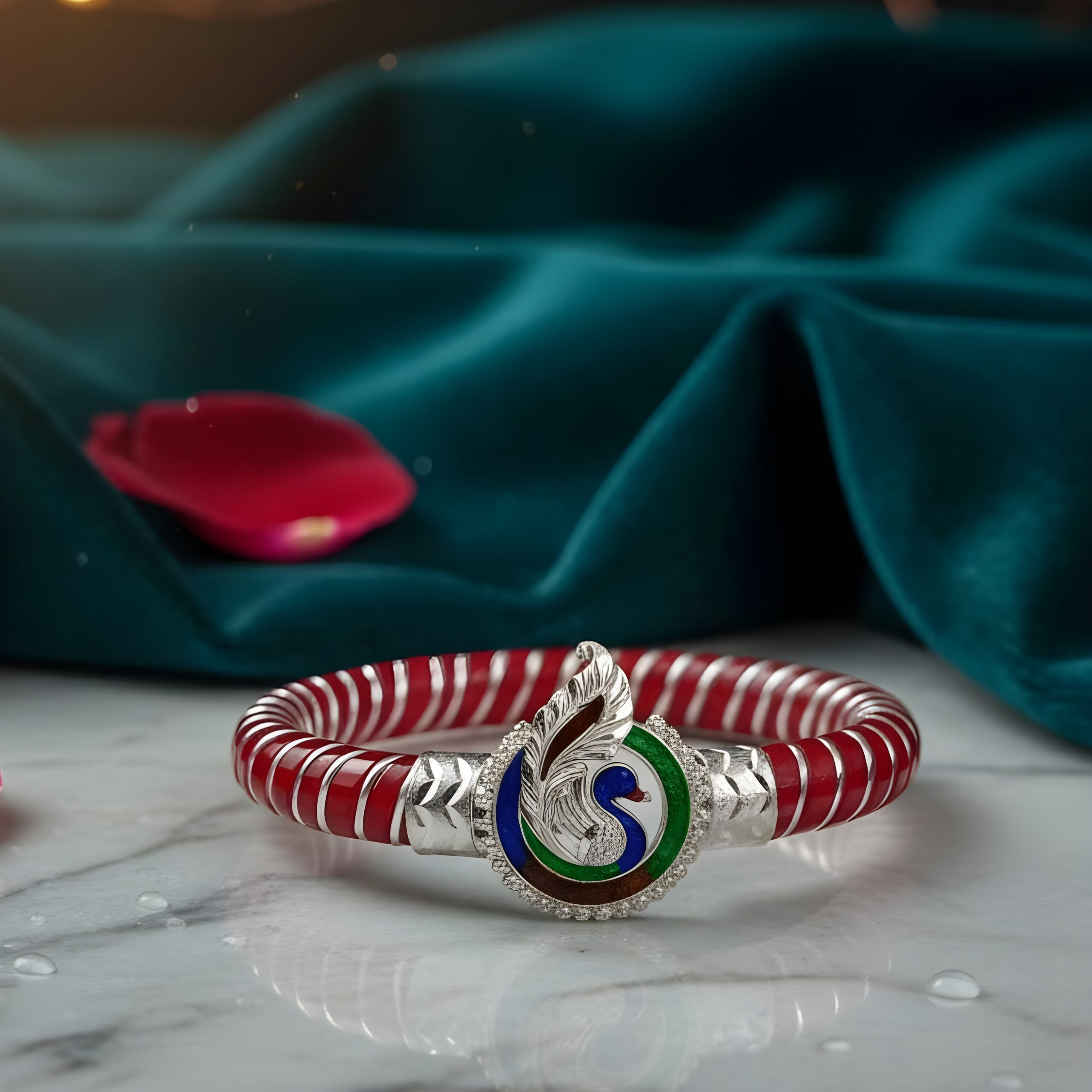 Add timeless elegance to your collection with this handcrafted silver pola bracelet. Featuring a vibrant red lacquer base and a beautifully detailed peacock design, this bracelet blends tradition and style effortlessly. Made from high-quality silver, it’s perfect for weddings, festivals, or cultural occasions. Whether you’re dressing up for a celebration or gifting a loved one, this silver pola bracelet makes a bold, graceful statement.