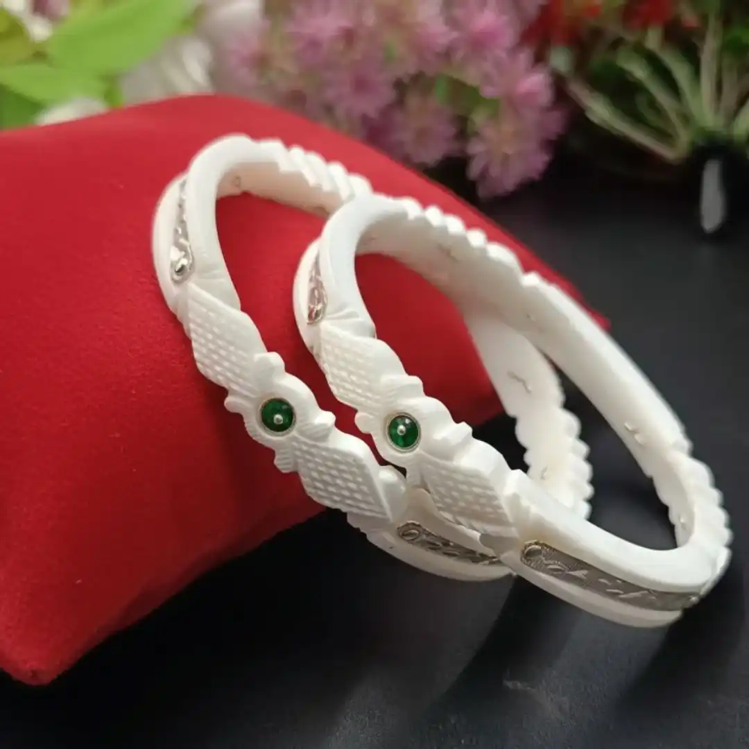 Add a touch of elegance and tradition to your ethnic look with these beautifully designed White Shankha Pola Bangles. Featuring delicate green stone highlights and subtle silver detailing, these bangles reflect classic Bengali heritage and timeless beauty. The textured white base gives a graceful finish while remaining lightweight and comfortable for long wear. Perfect for weddings, pujas, festivals, and daily traditional use, these bangles symbolize purity, prosperity, and marital bliss.