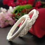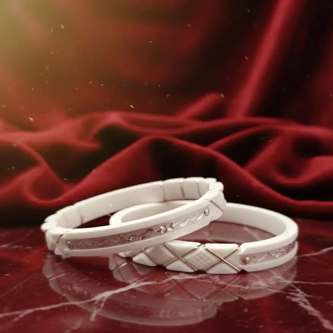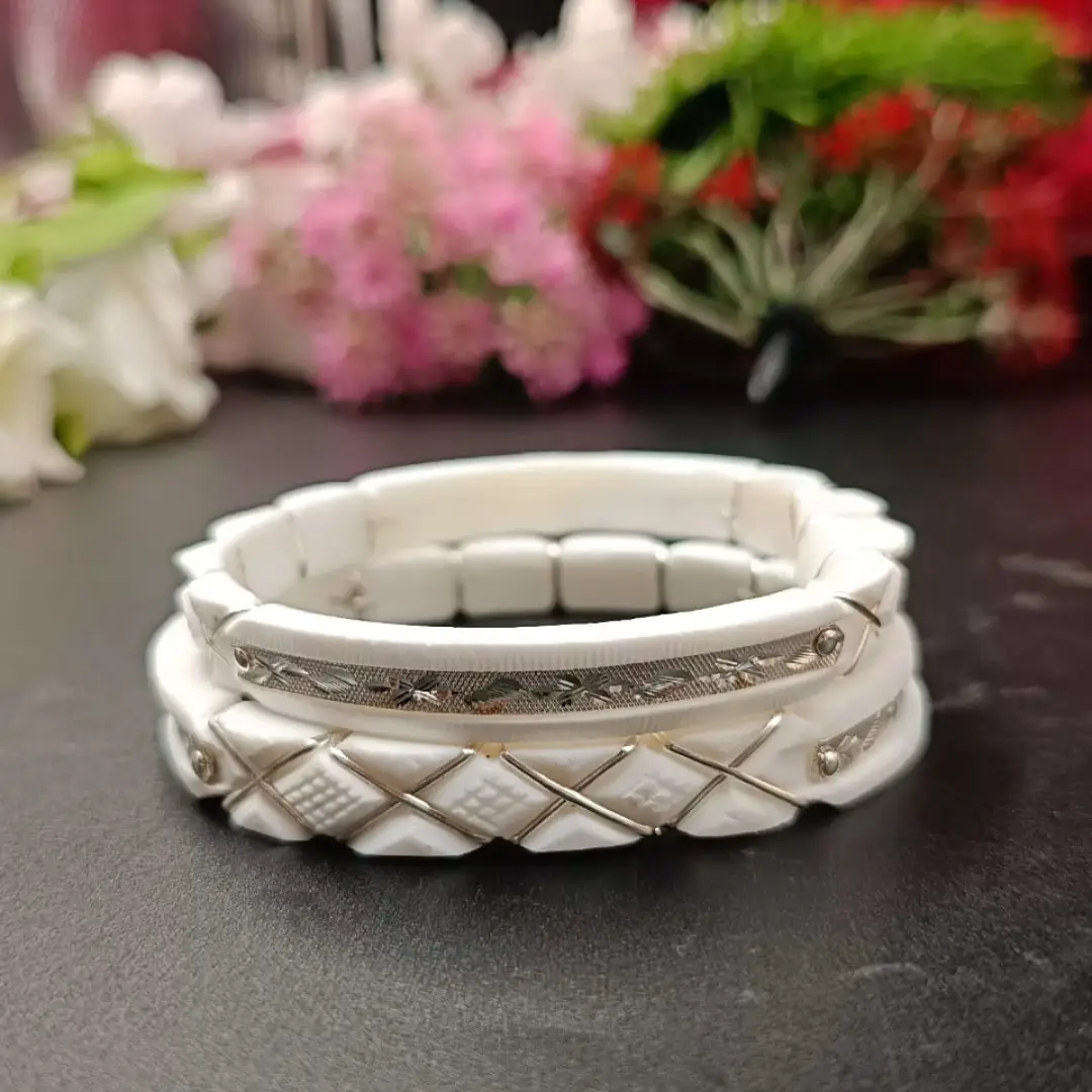 Embrace timeless Bengali elegance with these beautifully crafted White Shankha Pola Bangles, featuring refined silver wire wrapping and engraved silver detailing. The layered design adds depth and sophistication while maintaining a traditional aesthetic. Lightweight and comfortable, these bangles are ideal for everyday traditional wear as well as weddings, pujas, and festive occasions. A perfect symbol of purity, prosperity, and marital bliss, these bangles enhance any ethnic look effortlessly.