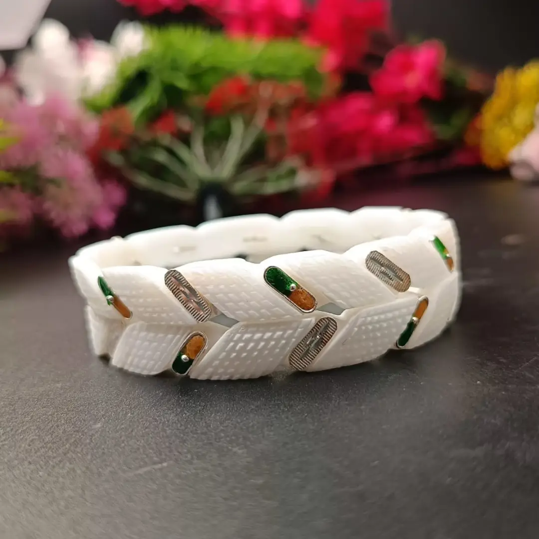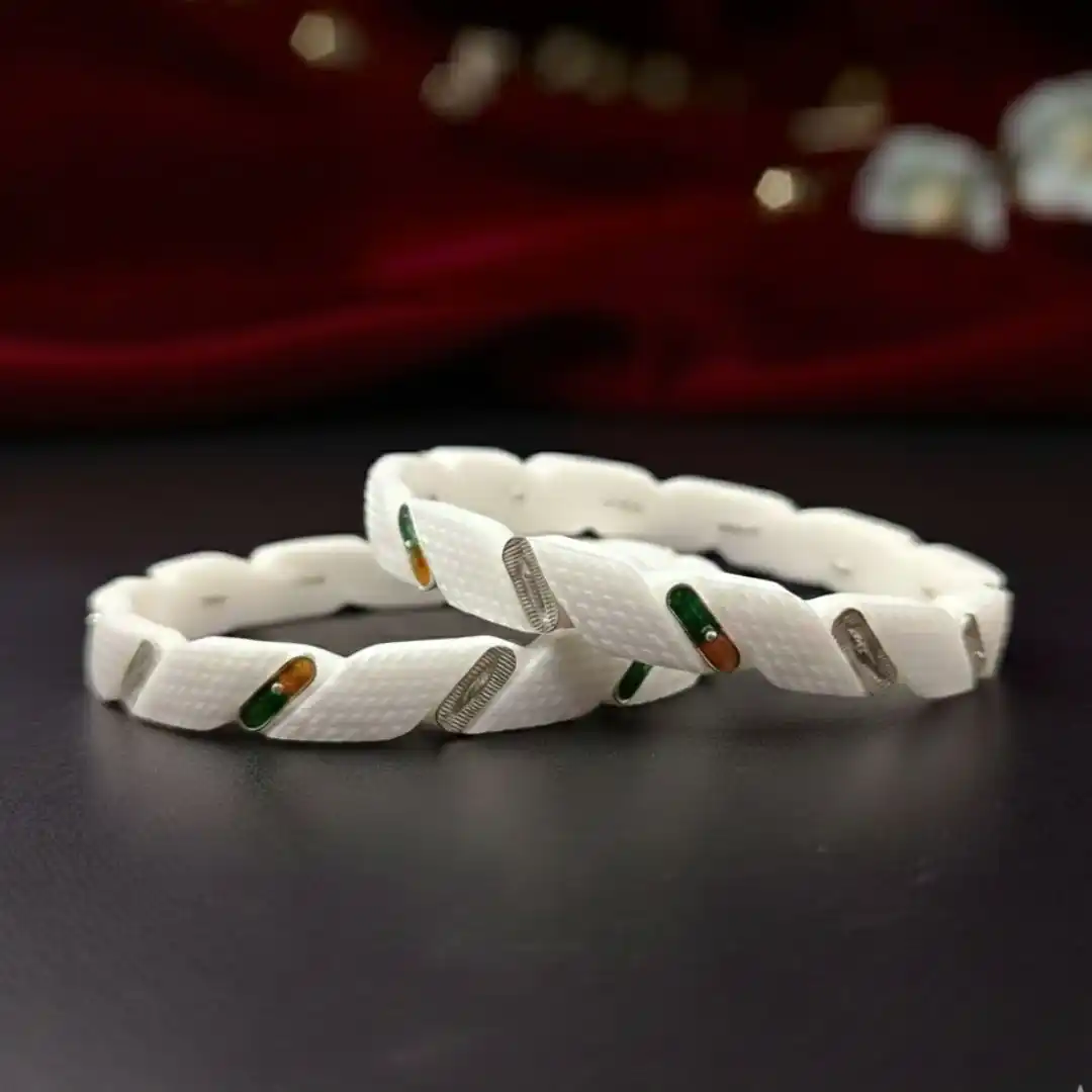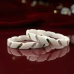 Bring home the elegance of Bengali tradition with these beautifully crafted White Shankha Pola Bangles, featuring a unique spiral-textured design with subtle green and amber stone accents. The smooth white finish combined with minimal decorative elements gives a graceful and contemporary traditional look. Lightweight and comfortable, these bangles are perfect for daily traditional wear, weddings, pujas, and festive occasions, symbolizing purity, prosperity, and marital bliss.
