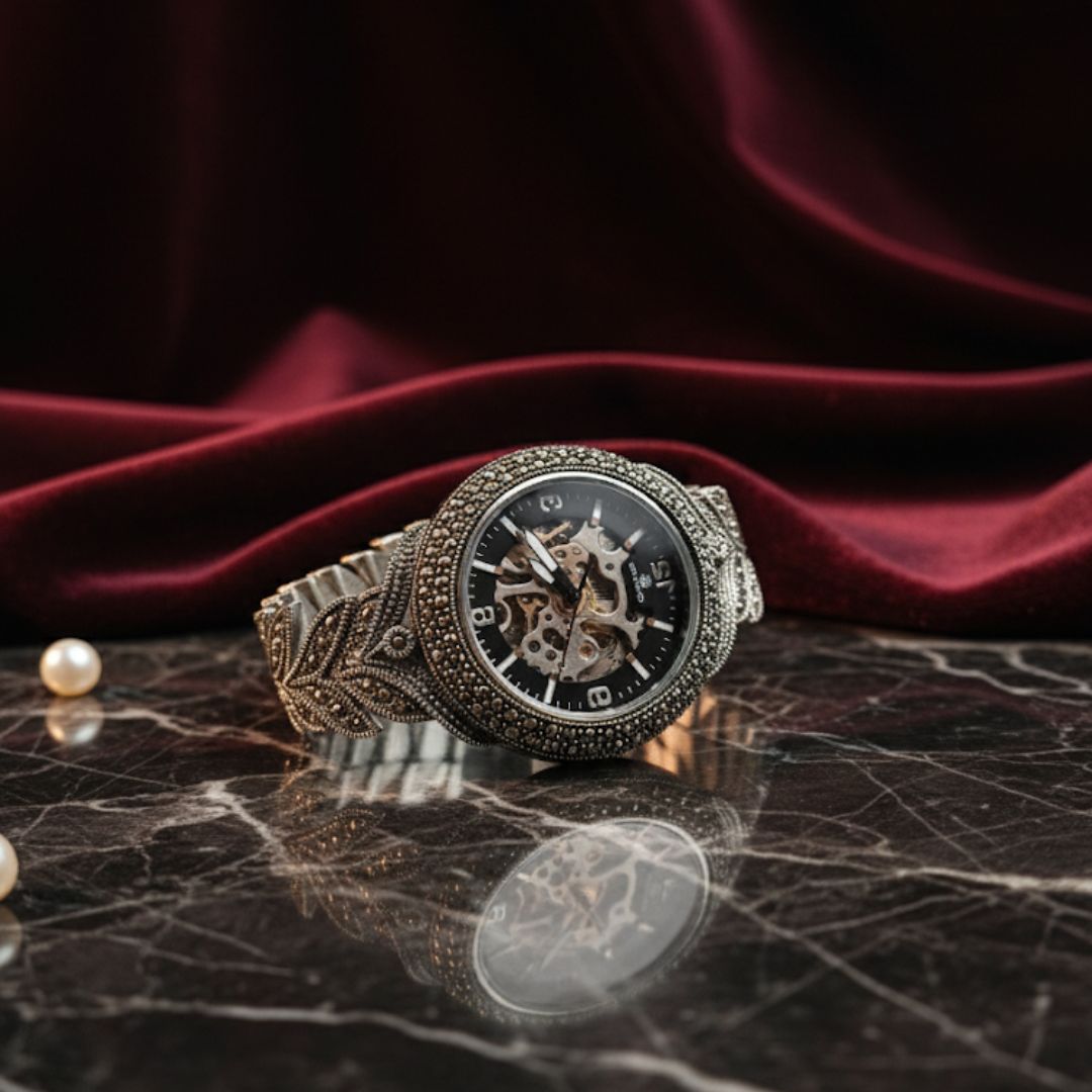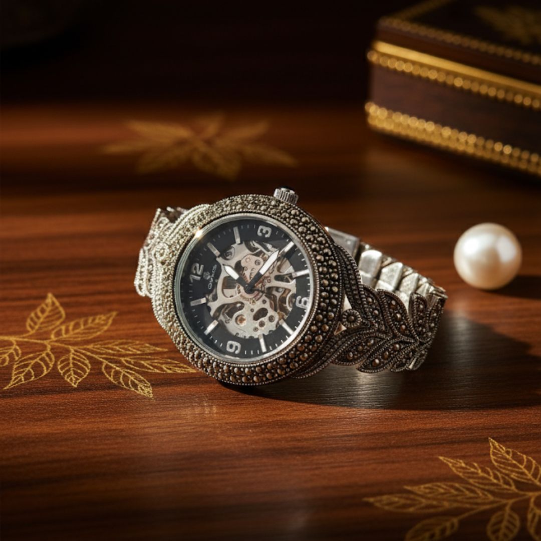 Make a bold yet timeless statement with this Vintage Marcasite 925 Silver Men’s Skeleton Bracelet Watch, crafted with meticulous attention to detail. The design combines the rugged charm of oxidized sterling silver with the elegance of hand-set marcasite stones, creating a luxurious vintage look.