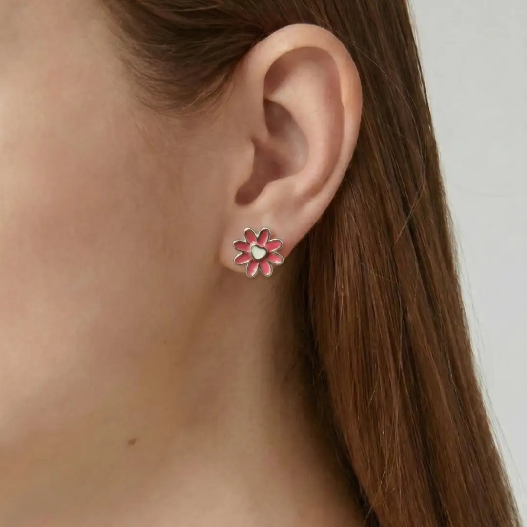 Add a touch of romantic flair to your daily ensemble with our Pink Floral Heart Enamel 925 Silver Stud Earrings. These dainty earrings showcase a unique ten-petal floral design in a vibrant pink enamel, beautifully centered with a delicate white heart. Handcrafted from premium 925 sterling silver, these stud earrings offer a playful yet sophisticated look that is perfect for any age.